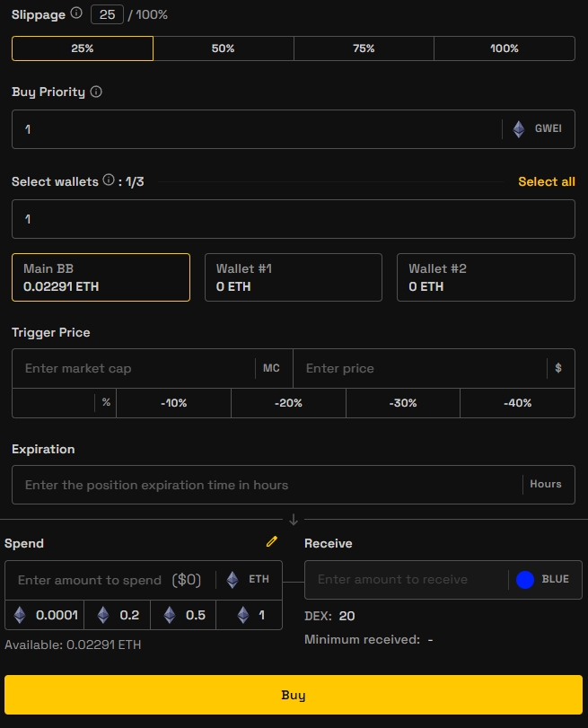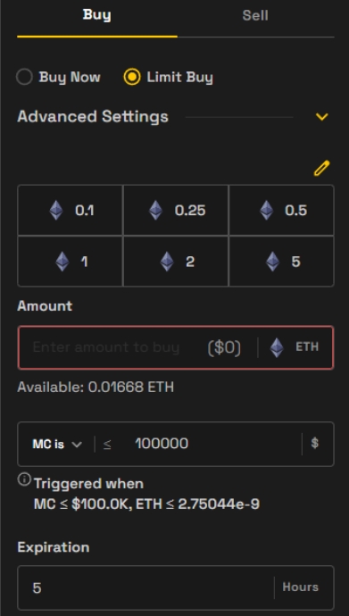 Choisissez le montant : Entrez le montant d'ETH que vous souhaitez dépenser ou utilisez les valeurs prédéfinies (par exemple, 0.1, 0.25 ETH).