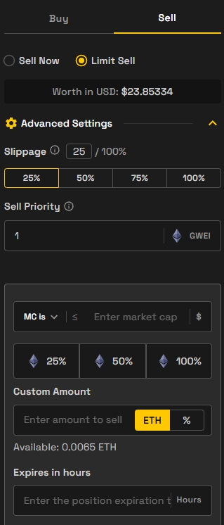 Slippage: Personnalisez la tolérance au slippage (par exemple, 25%, 50%, 75%).
