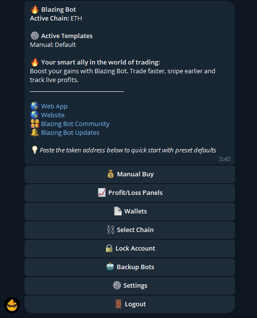 Commencer est aussi simple que d'entrer l'adresse du contrat du token dans le chat du bot Telegram. À partir de là, Blazing App évaluera efficacement le statut de votre token, déterminant s'il est en train de se négocier activement ou s'il est encore en phase pré-lancement, préparant ainsi le terrain pour votre succès en trading.