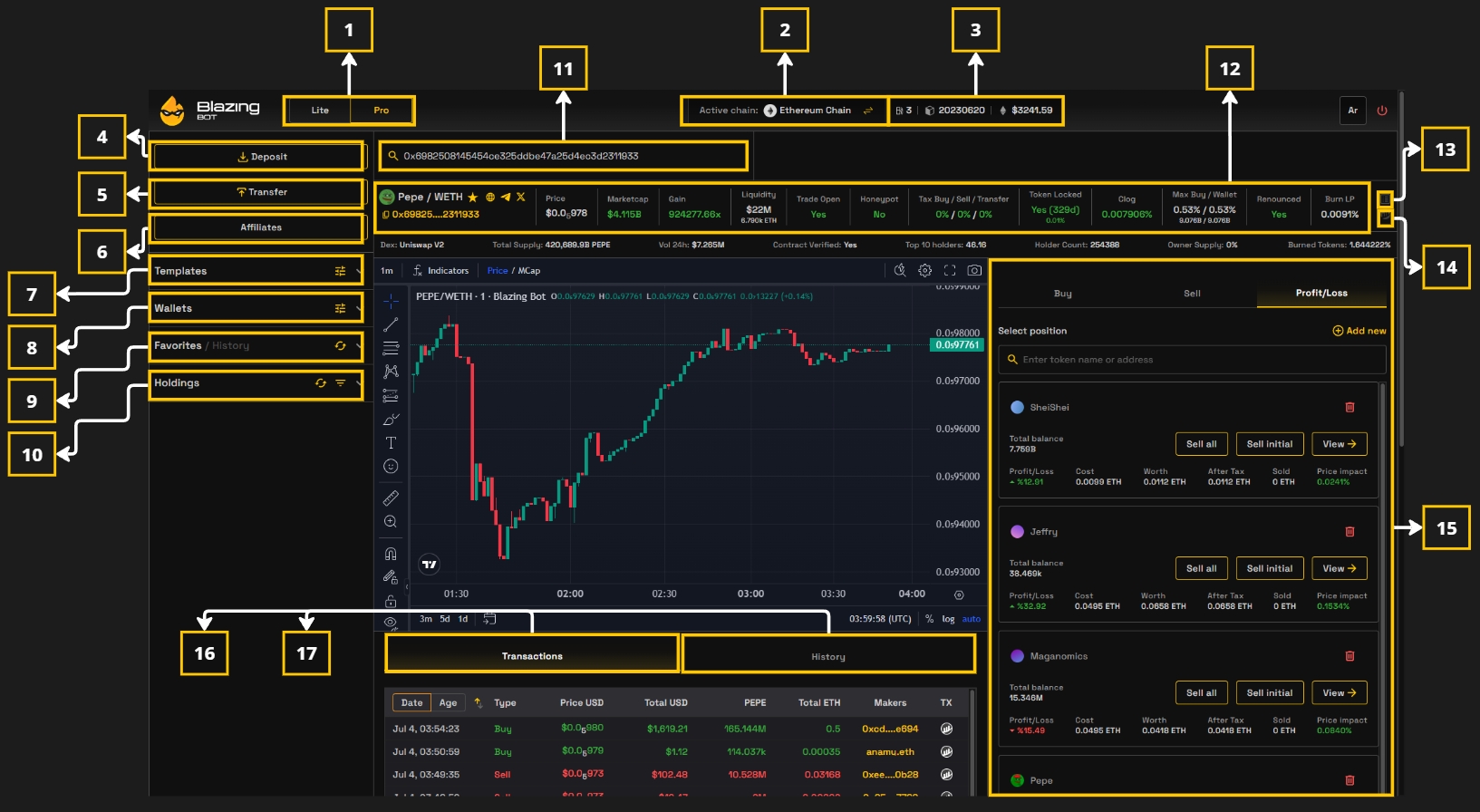 La version Pro de Blazing App est parfaite pour les traders expérimentés en onchain. Un grand nombre de paramètres vous aidera à rendre votre trading plus efficace.