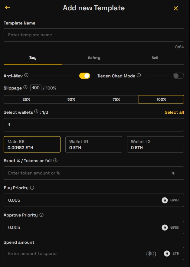 Priorité d'achat: Ce paramètre vous permet de sélectionner le paramètre PriorityFee pour les transactions d'achat. Si laissé vide, la valeur par défaut du système sera utilisée.