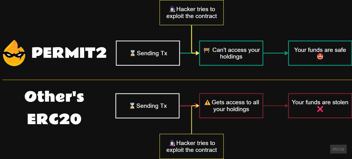 • Protection. Even if a router contract is compromised, Permit2 keeps funds secure from unauthorized actions.