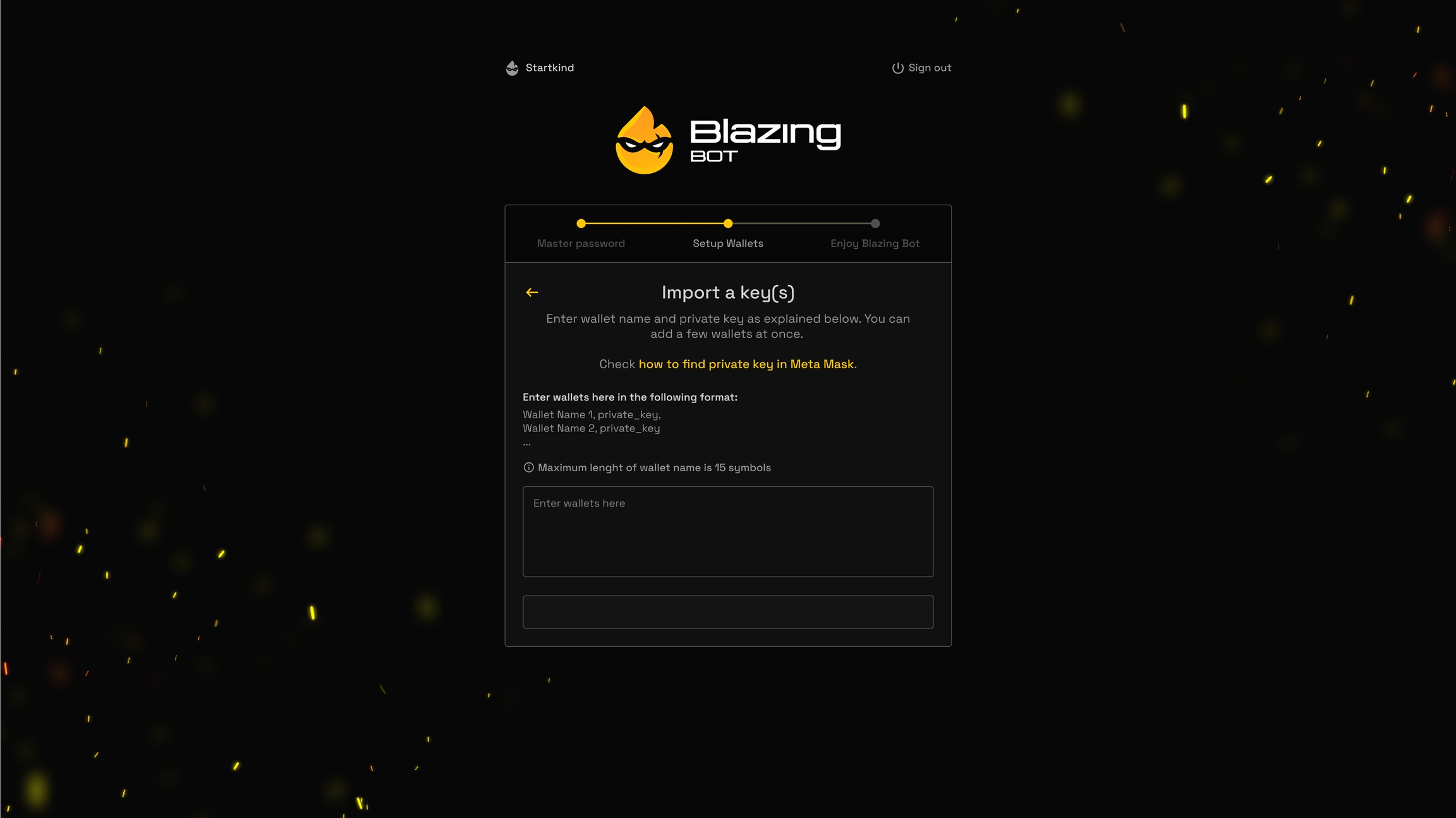 Paste the private key of the wallet you want to import into Blazing App. You can import multiple wallets at once by pasting the private keys as a list.