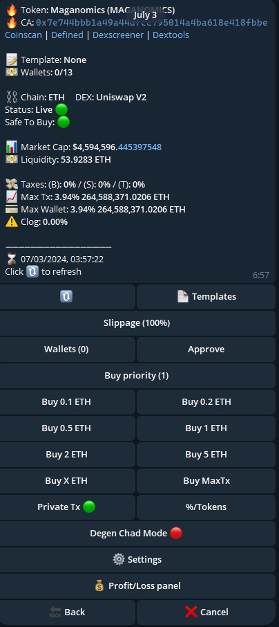 Start by copying and pasting the token contract into the bot chat or pressing Snipe in the Prelaunch Sniper module, and then copy and paste the token contract.