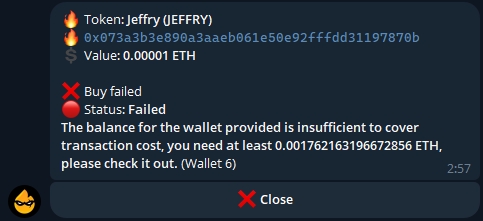 Sometimes, the following errors may occur during the purchase. To fix this, ensure the selected wallet has enough funds to purchase and that the token meets all your settings.