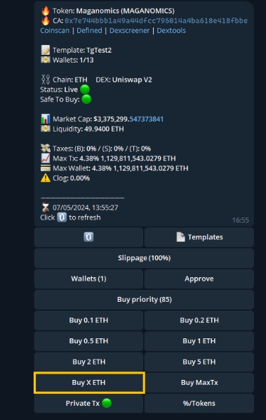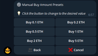 After pasting the contract and selecting buy settings, choose the buy amount from presets or enter the custom amount by pressing Buy X ETH