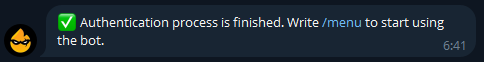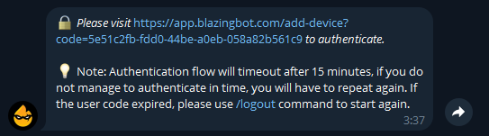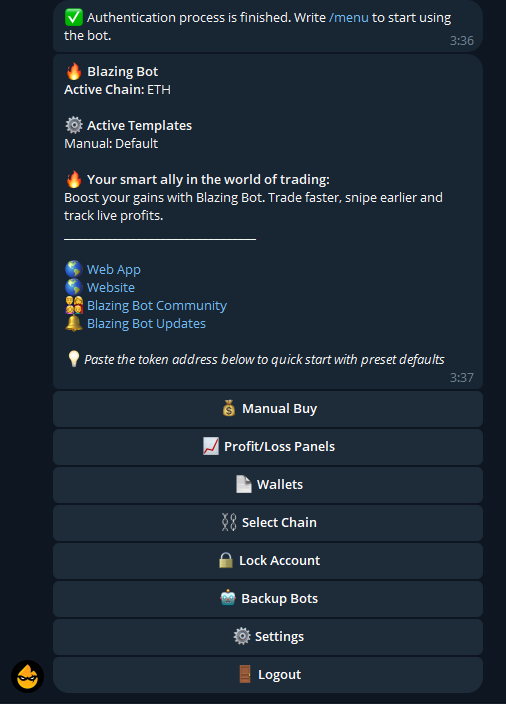 When login is successful, you can head back to Telegram and you will see the following message from Blazing App.