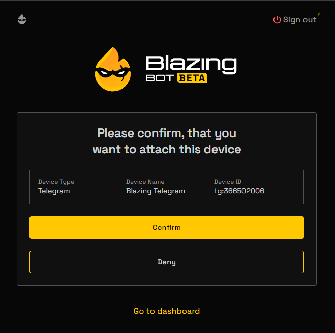 If you already logged to WebApp, the bot will send you an activation link for authorization. Here, you can just click Confirm to authentificate telegram bot.