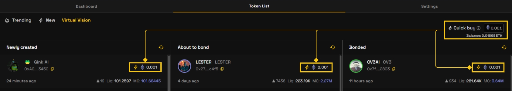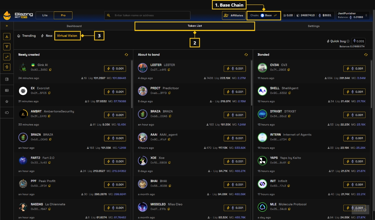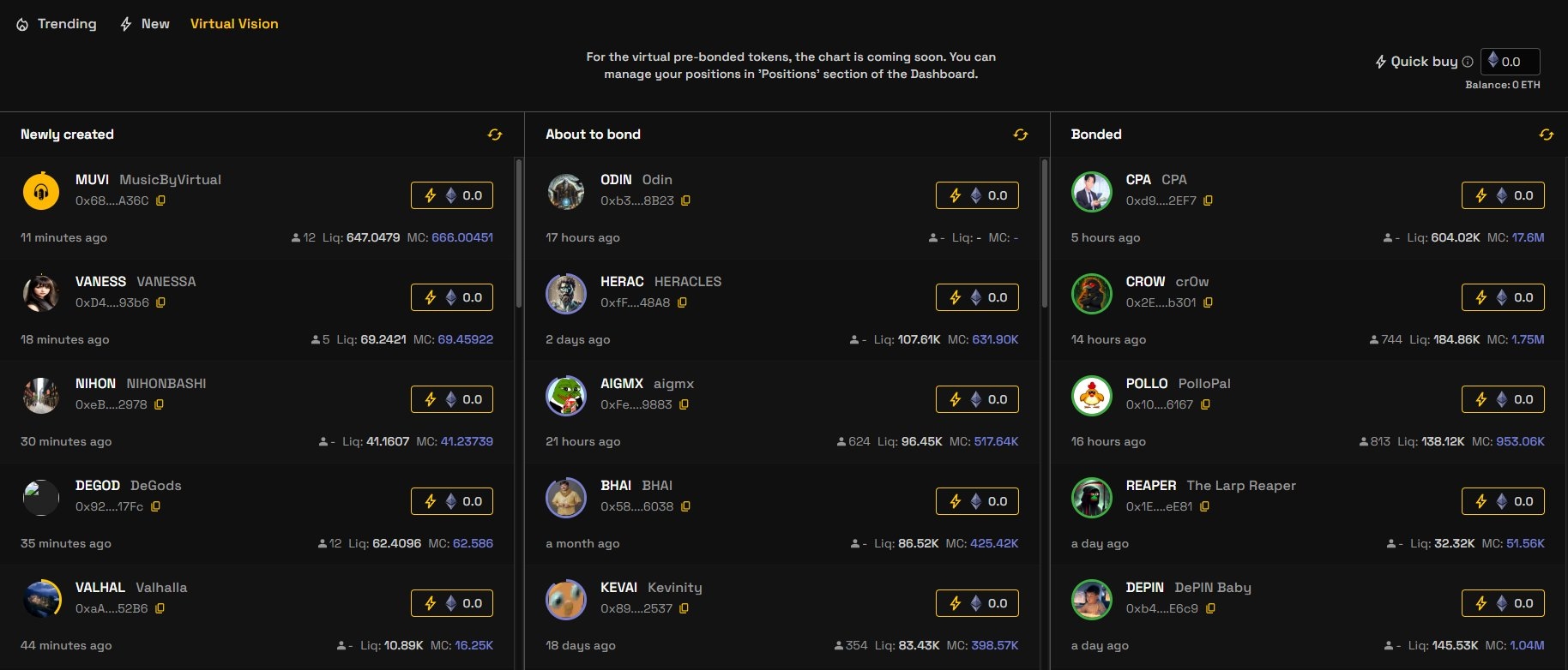 Virtual Vision is a dedicated token tracking feature within Blazing App. It lets you monitor, analyze, and trade virtual tokens across three lifecycle stages: Newly Created, About to Bond, and Bonded.