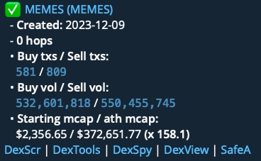 Пример анализа: Токен MEMES, созданный 9 декабря 2023 года инициирующим кошельком (0 хопов), продемонстрировал рост после запуска. Начав с рыночной капитализации в 2 356,65 долларов, он впечатляюще вырос до рекордной рыночной капитализации в 372 651,77 долларов.