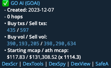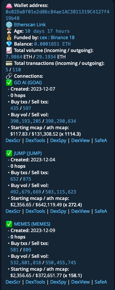 Пример анализа: Например, если основной кошелек (Hop 0) запустил токен под названием "GO AI (GOAI)" 2023-12-07, в анализе будут подробно описаны его показатели - количество сделок купли-продажи, объемы торгов, рыночная капитализация и метрики роста (например, 1114-кратное увеличение с момента запуска).