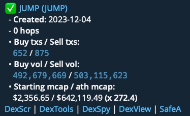 Пример анализа: Токен JUMP (JUMP), созданный 4 декабря 2023 года на основном кошельке (0 хопов), продемонстрировал значительную торговую активность после запуска: в общей сложности было совершено 652 сделки на покупку и 875 сделок на продажу.