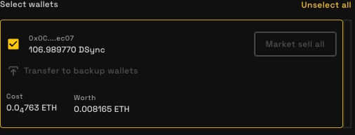 Продать все по рынку (Market Sell All) – мгновенно продаст выбранный токен со всех кошельков, на которых есть средства.